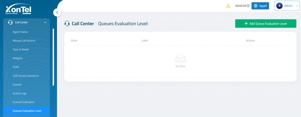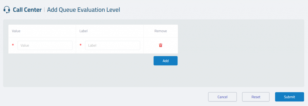 The Queue Evaluation Level page is used to create evaluation levels that will later be available for queue call assessment.