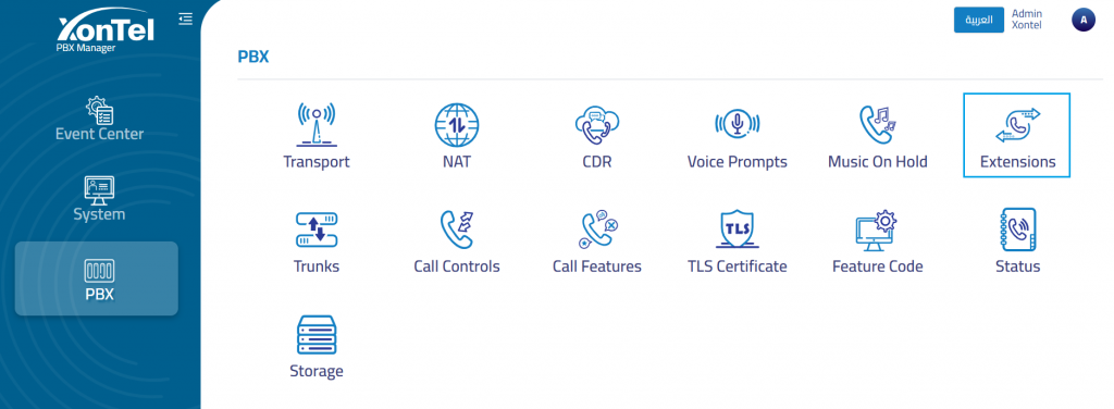 The Extensions module allows you to configure and manage individual user extensions within the PBX system.