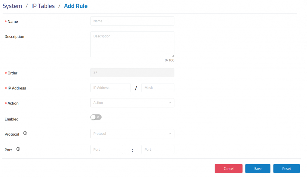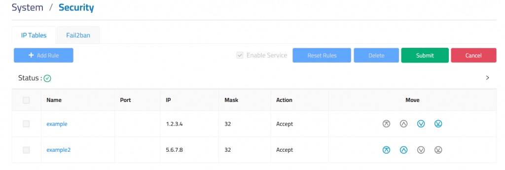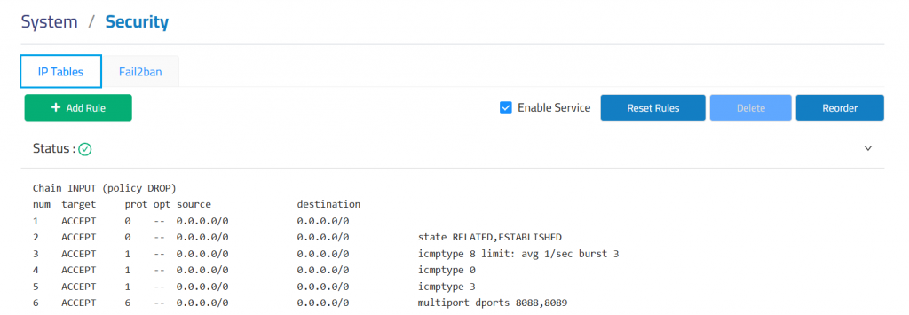 To manage iptables, first enable the service by checking the Enable Service option. Once enabled, you can create, delete, modify, disable, or reorder firewall rules. Be sure to click the Save button after each change; otherwise, the modifications will not take effect in the system.