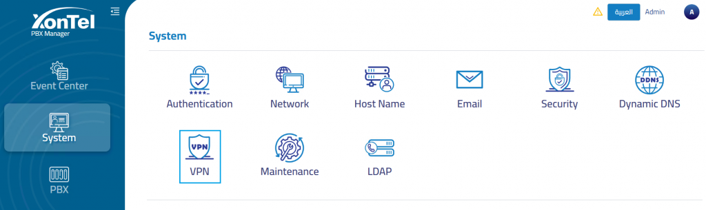 VPN(Virtual Private Network)is a network technology that creates a secure remote network connection over a public network through encrypted tunnel and conversion of data’s destination address. XonTel PBX can serve as a VPN client to connect with VPN server.