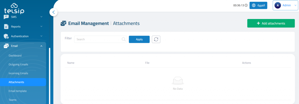 The Attachments section provides an organized view of all files that have been uploaded through the email system to use in outbound emails.