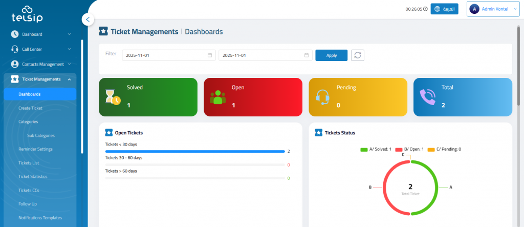 The Ticket Management Dashboard provides a centralized view of all ticket activity within the selected date range. This interface allows administrators, support agents, and managers to track, analyze, and respond to support tickets efficiently.