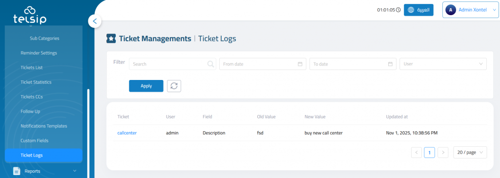The Ticket Logs module provides a detailed audit trail of every change made to the description field of tickets. It tracks who made the change, the previous value, and the new value.