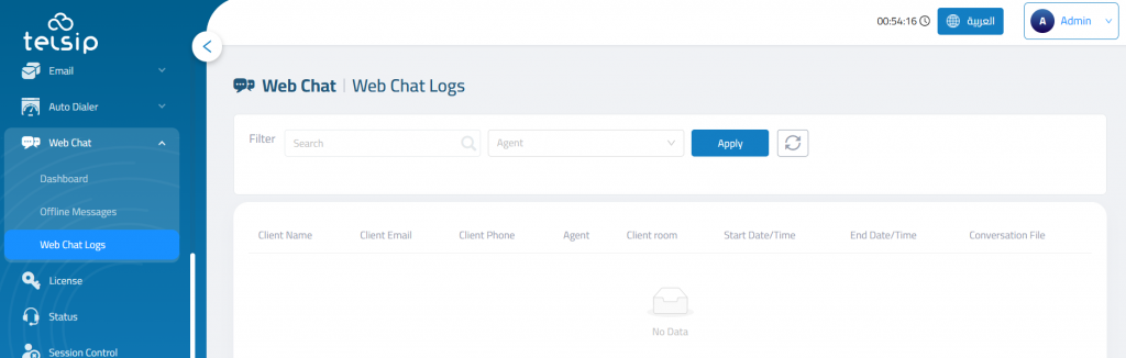 The Web Chat Logs section stores a complete history of all conversations that took place through the live chat system. This is your go-to area for reviewing past chats, tracking agent activity, and exporting records if needed.