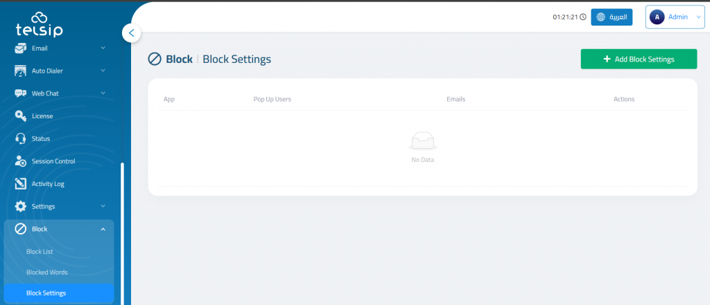 The Block Settings page defines how the system should behave when blocking actions occur. This includes who gets notified within each communication app.
