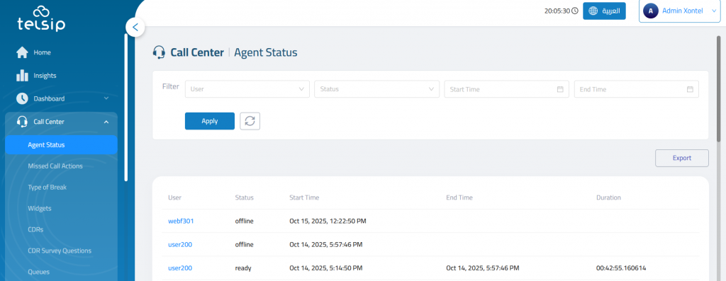 The Agent Status provides historical visibility into agent activity within a call center environment. It enables supervisors and administrators to track when agents are ready, in call, or offline, along with the exact time spent in each status.