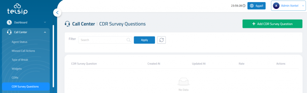 The CDR Survey Question module allows call center administrators or supervisors to create and manage post-call survey questions that are linked to Call Detail Records (CDRs). These questions help in capturing customer feedback and evaluating agent performance and customer satisfaction.