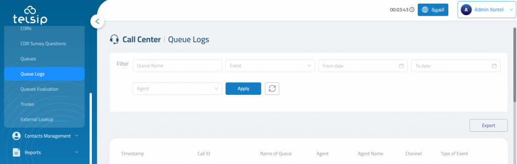 The Queue Logs module records detailed events and changes related to queues. This log is essential for auditing queue activities.