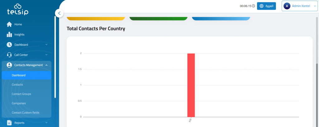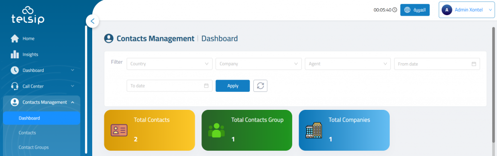 The Contacts Management Dashboard provides a high-level view of all contacts, grouped data, and associated companies. It is a central visual reporting area that gives immediate insights into contact distribution and volume by country, agent, or organization.