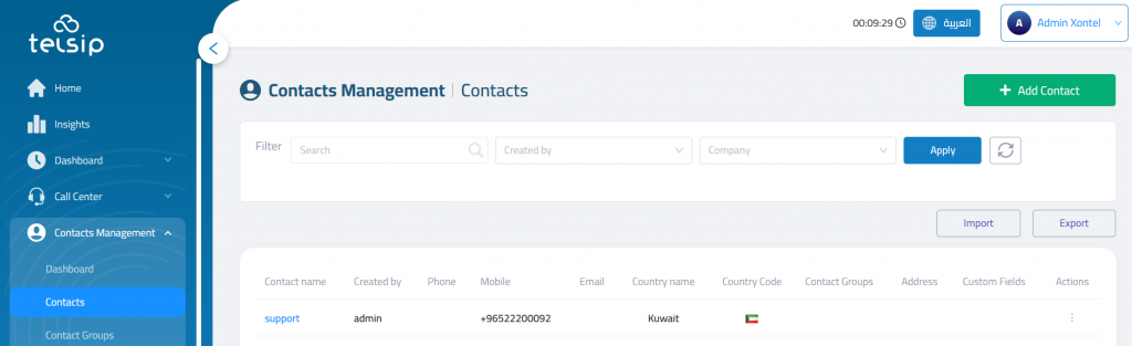 The Contacts module provides a detailed list of all contacts registered in the system. This view allows users to search, view, and manage individual contacts, as well as import/export data.