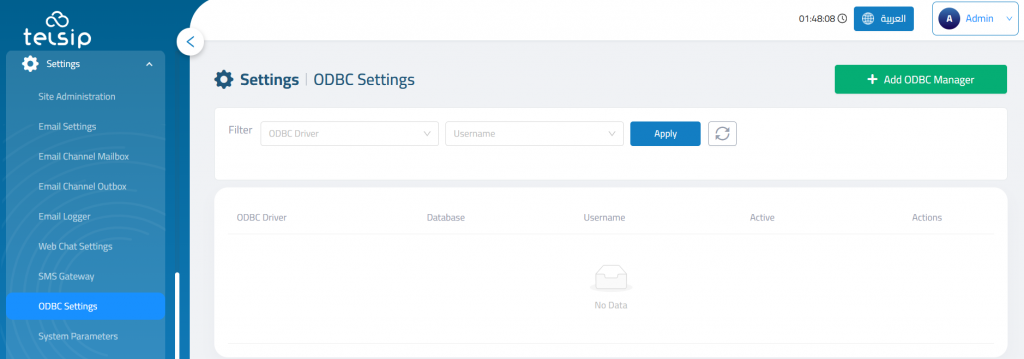 The ODBC Settings section allows administrators to configure and manage database connections using the Open Database Connectivity (ODBC) standard. These settings enable the system to interface with external databases, essential for logging, reporting, and analytics.