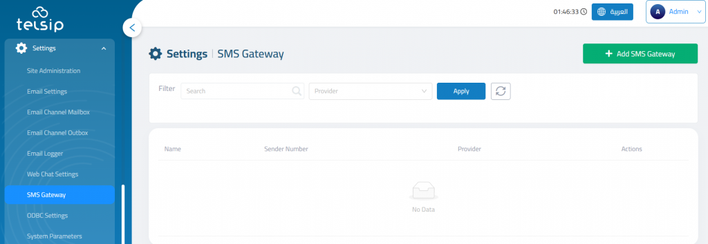 The SMS Gateway allows administrators to integrate and manage external SMS providers that the system uses to send text messages. This includes alerts, missed call notifications, and ticket updates.