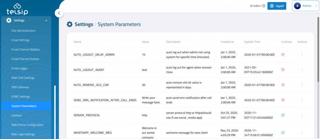 The System Parameters panel allows system administrators to configure essential behaviors of the system. These settings determine automatic actions such as logouts, data cleanup, message notifications, and connection protocols.