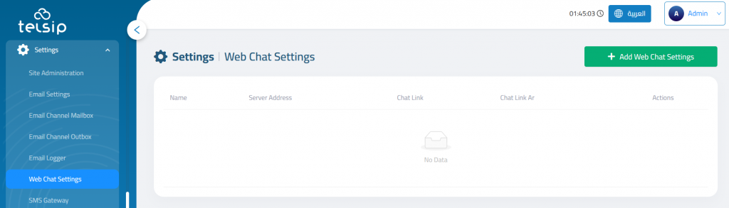 The Web Chat Settings page allows administrators to configure the integration of a live chat widget for websites. This script-based widget enables real-time communication between site visitors and support agents.
