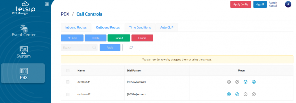 The Outbound Route section defines how internal users can make calls to external numbers through selected trunks. It controls which extensions are allowed to dial out, what trunk they use, and how numbers should be formatted.