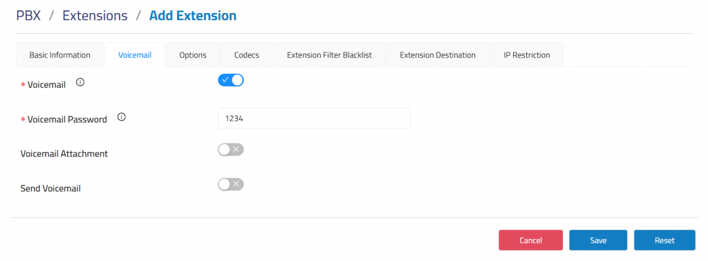 Voicemail: Enable this option to activate voicemail functionality for the extension,Voicemail is enabled by default.