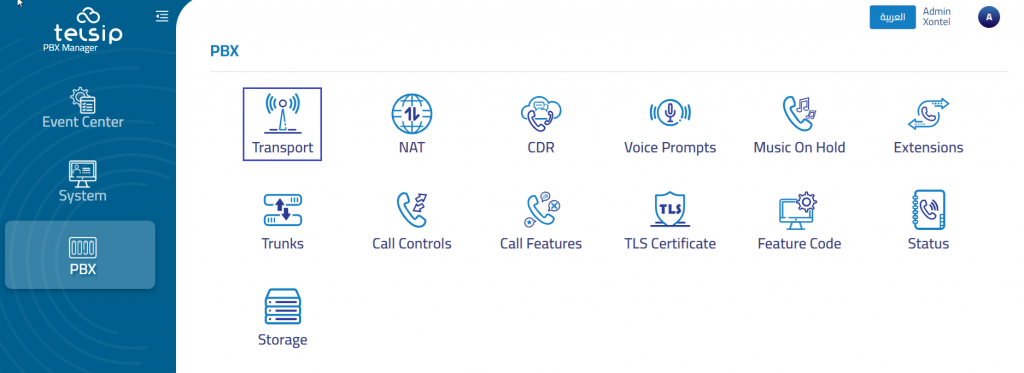 Edit Transport to choose the default one that will be used for extensions and trunks. You can also change the Bind Port.