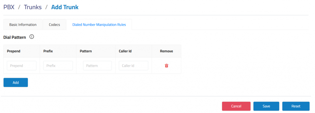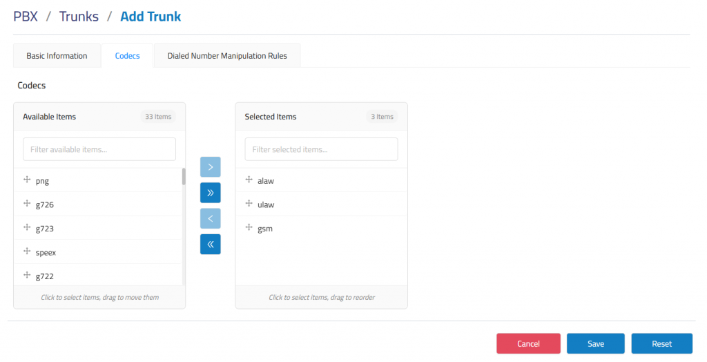 The Codecs tab allows you to manage which audio formats your PBX uses during SIP trunk calls. These codecs define how voice data is compressed and transmitted over the network.
