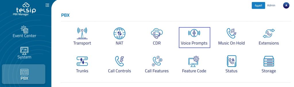 The Voice Prompts section allows you to upload custom audio messages used throughout your PBX system, such as IVR menus, Ring Groups, or queue messages.