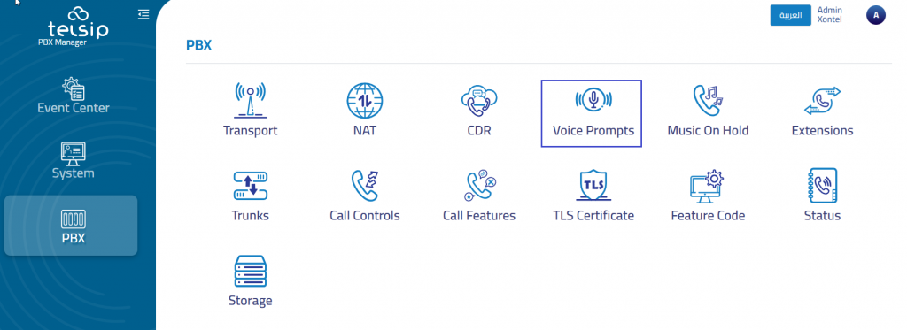 The Voice Prompts section allows you to upload custom audio messages used throughout your PBX system, such as IVR menus, Ring Groups, or queue messages.