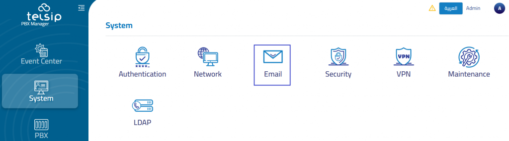 The Email settings section allows administrators to configure outbound email delivery from the PBX system. This is essential for sending system notifications and resetting passwords.