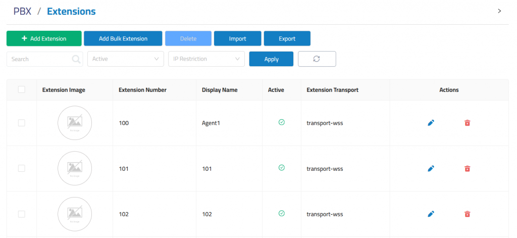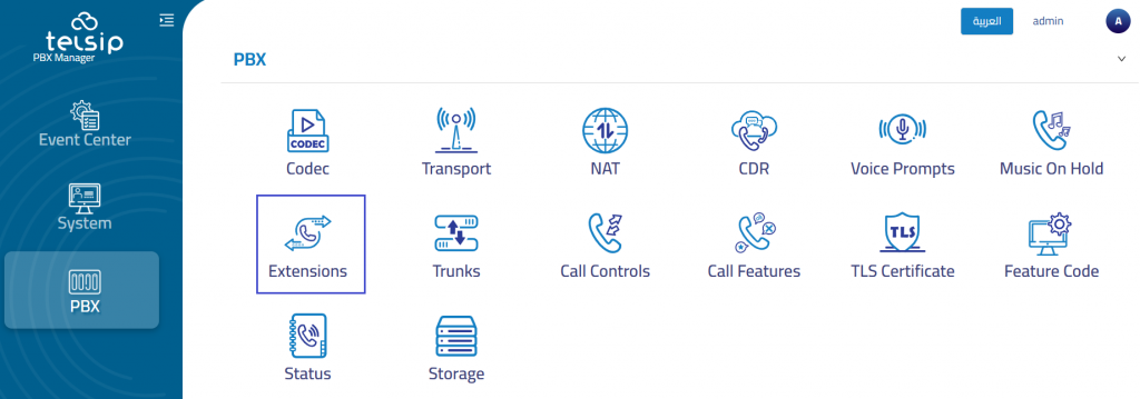 The Extensions module allows you to configure and manage individual user extensions within the PBX system.