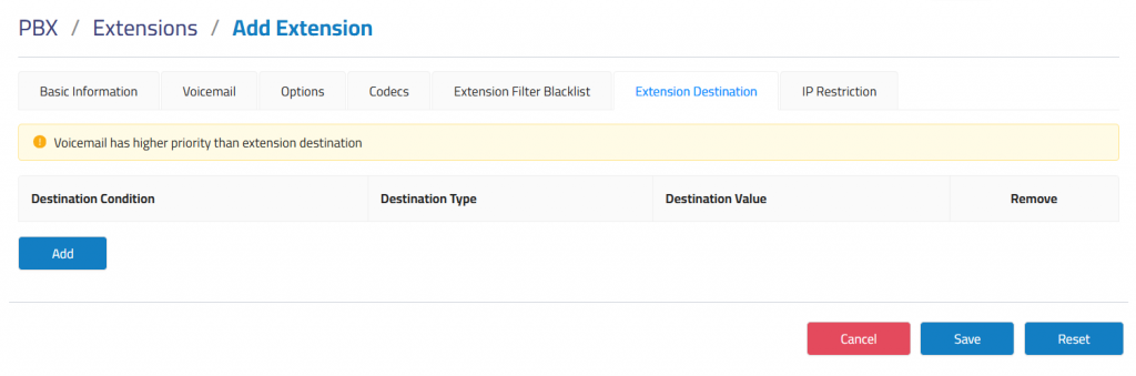 Destination condition: Define how incoming calls are routed based on specific conditions.
