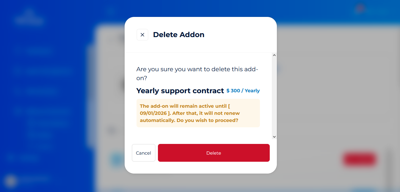 If an add-on was included in your plan from the start and you choose to remove it, it will remain active until the end of the current subscription period, but it will be removed when the subscription renews.