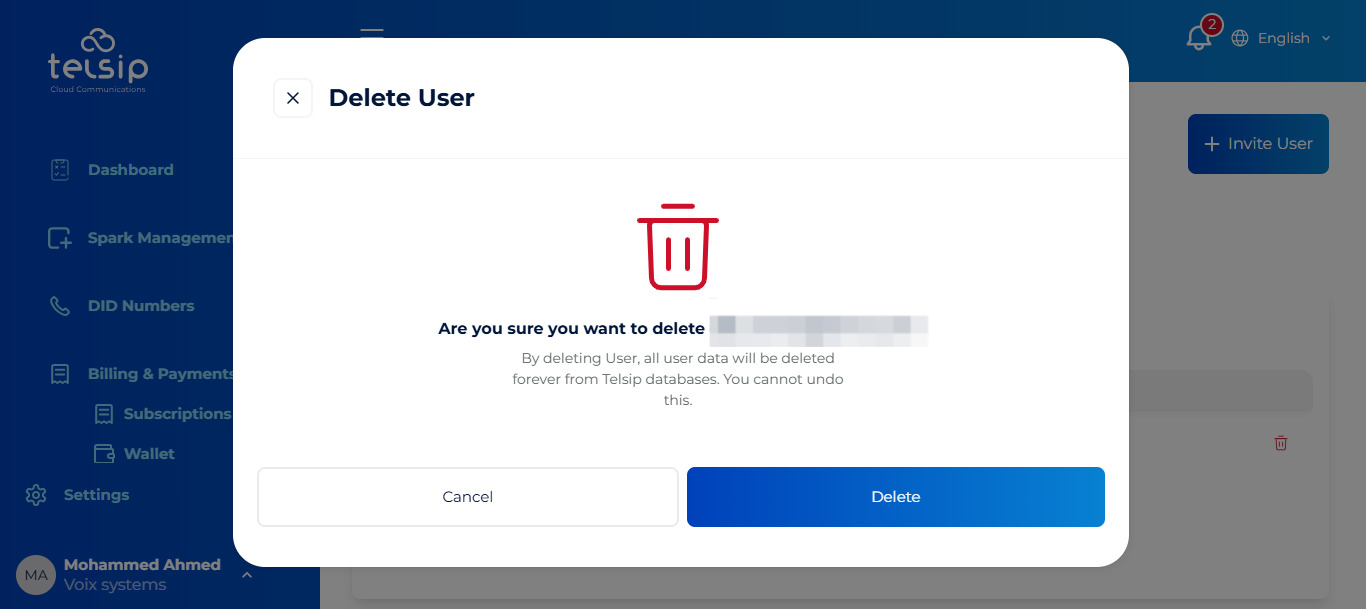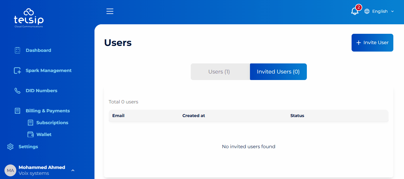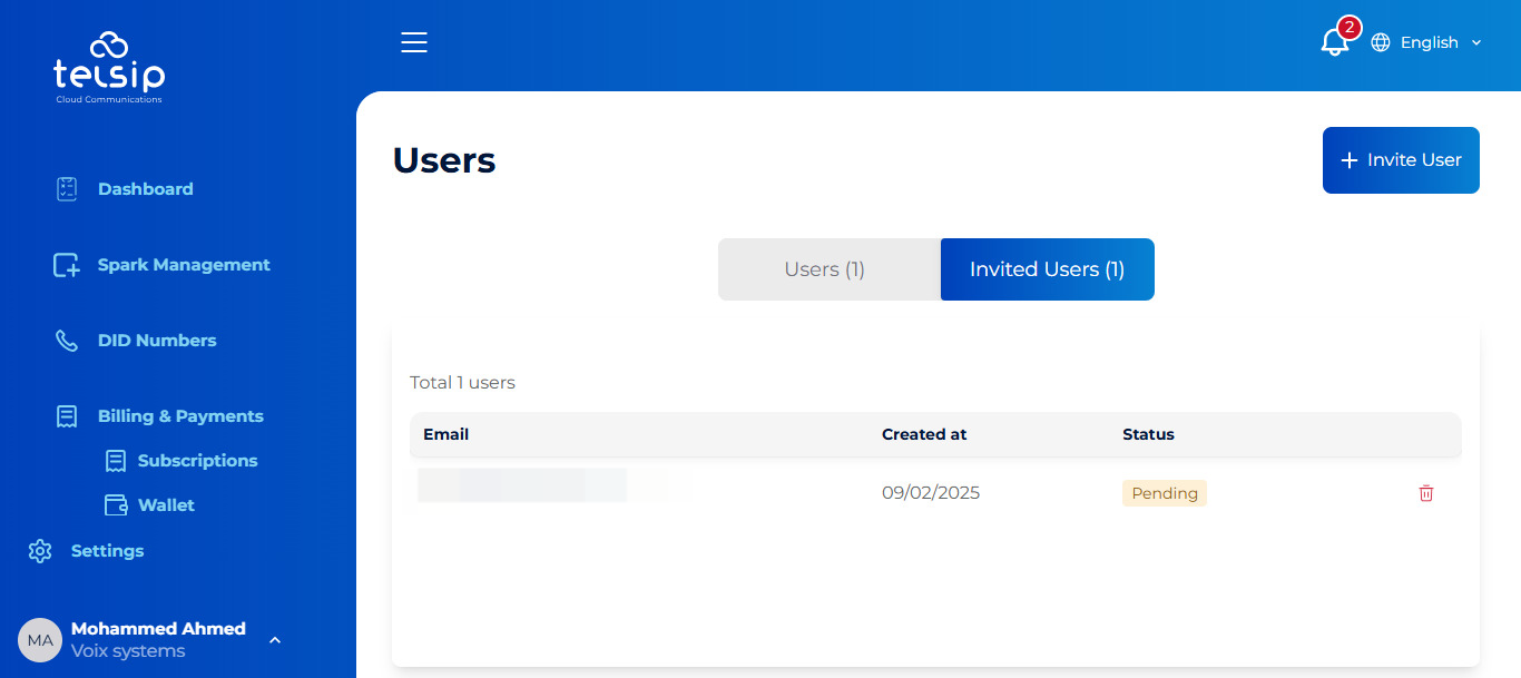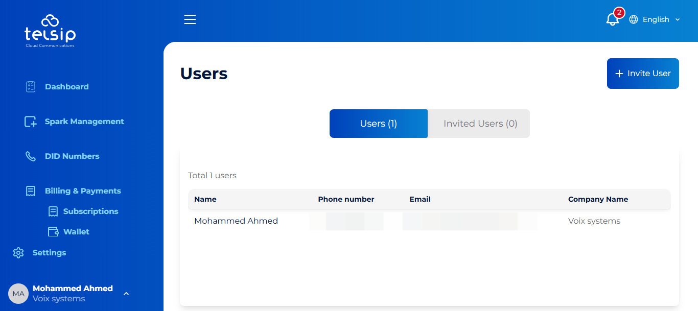 In this section, you can view and manage users who have access to your TelSip User Portal.