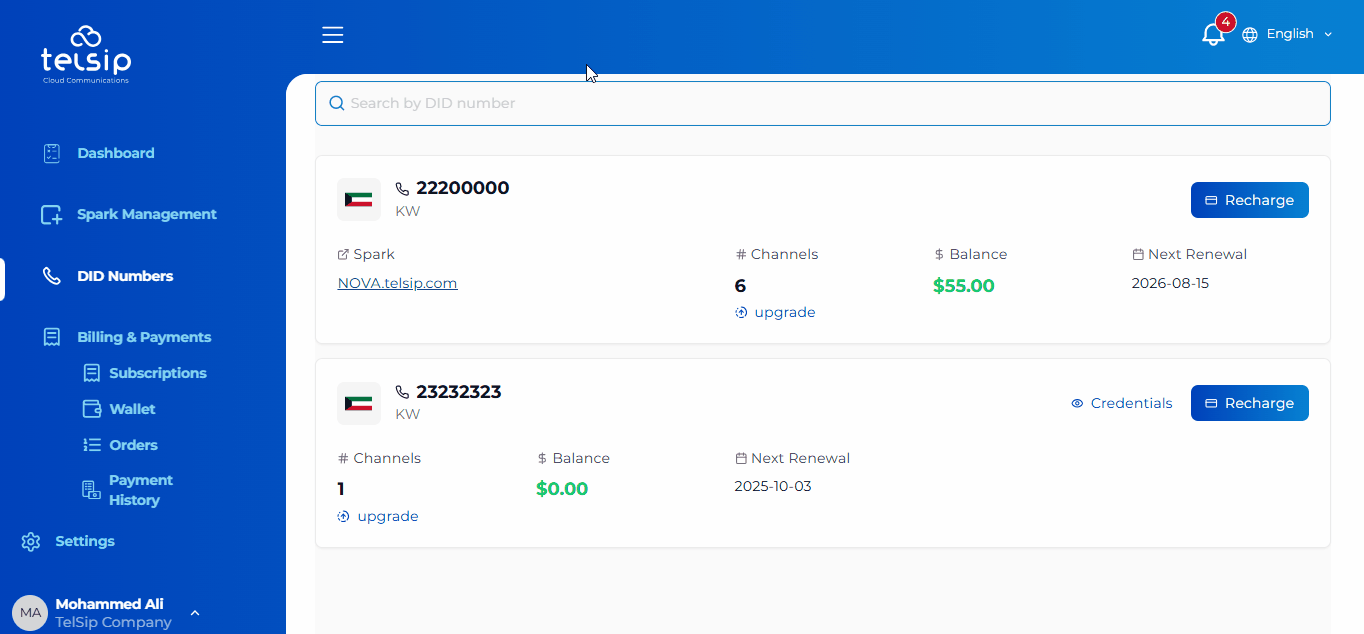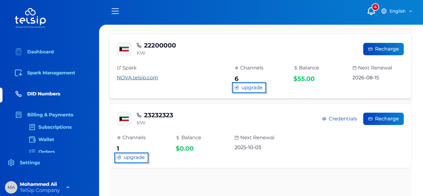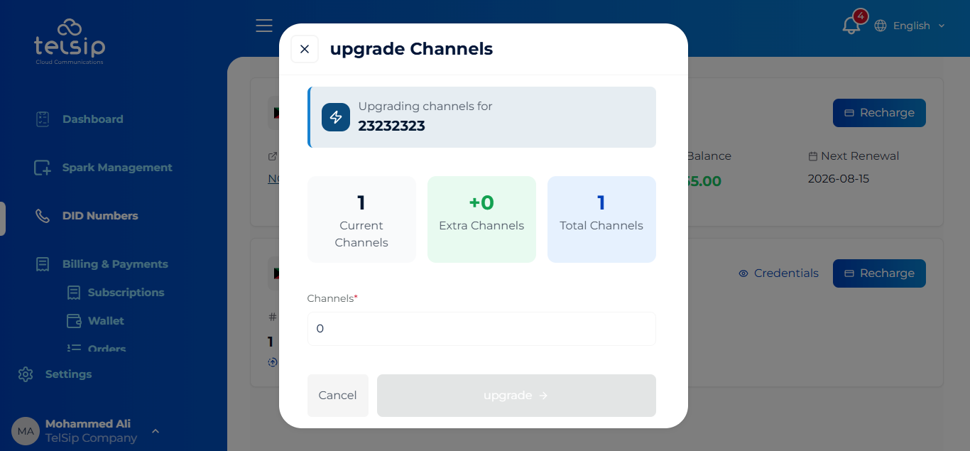 - Upgrade the number of channels linked to your DID to handle more concurrent calls.